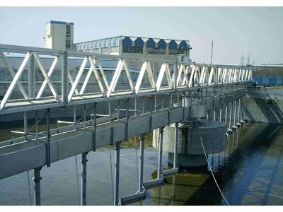 周邊傳動(dòng)刮吸泥機(jī)的工作流程:污水從池中間的進(jìn)水管經(jīng)導(dǎo)流筒分散后,均勻地向周邊呈輻射狀流出,呈懸浮狀的